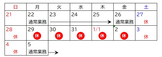 休業期間中のメール・電話・FAX等のお問合せについては、